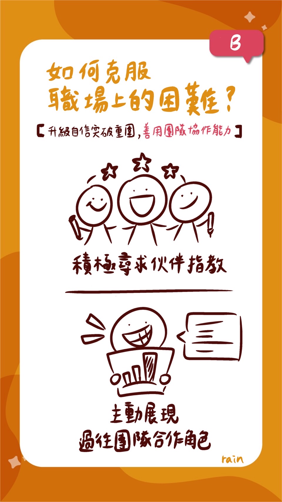 建議可以多加善用團隊協作,將問題從發現、拆解、再到共同解決方案,積極尋求夥伴的指教,大大發揮 1+1>2 的力量囉~