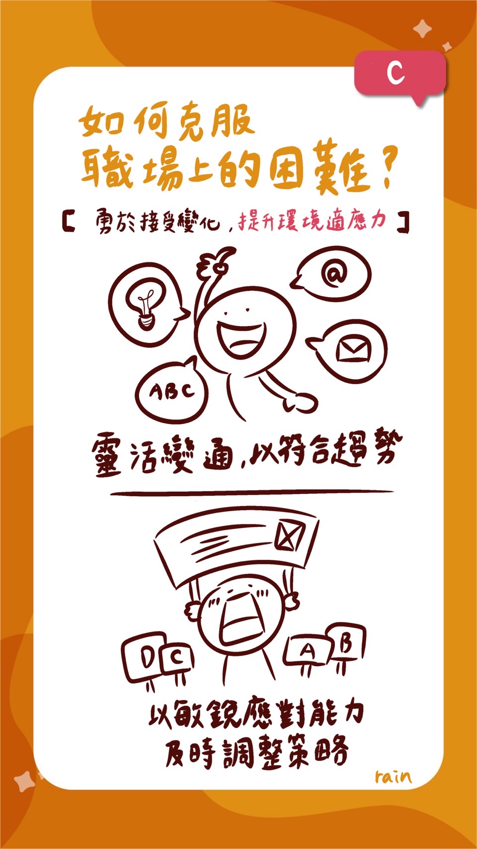 即使是非黑即白看似簡單的問題,在職場中都有可能隨時充滿變數。以往的處理方式可能會稍顯不足,需要根據當前狀況作出相應的改變。例如,定期更新調研方式,以適應實際情況的變化;工作流程根據客戶的需求進行調整;行銷策略依照目標客群或產品特性變動