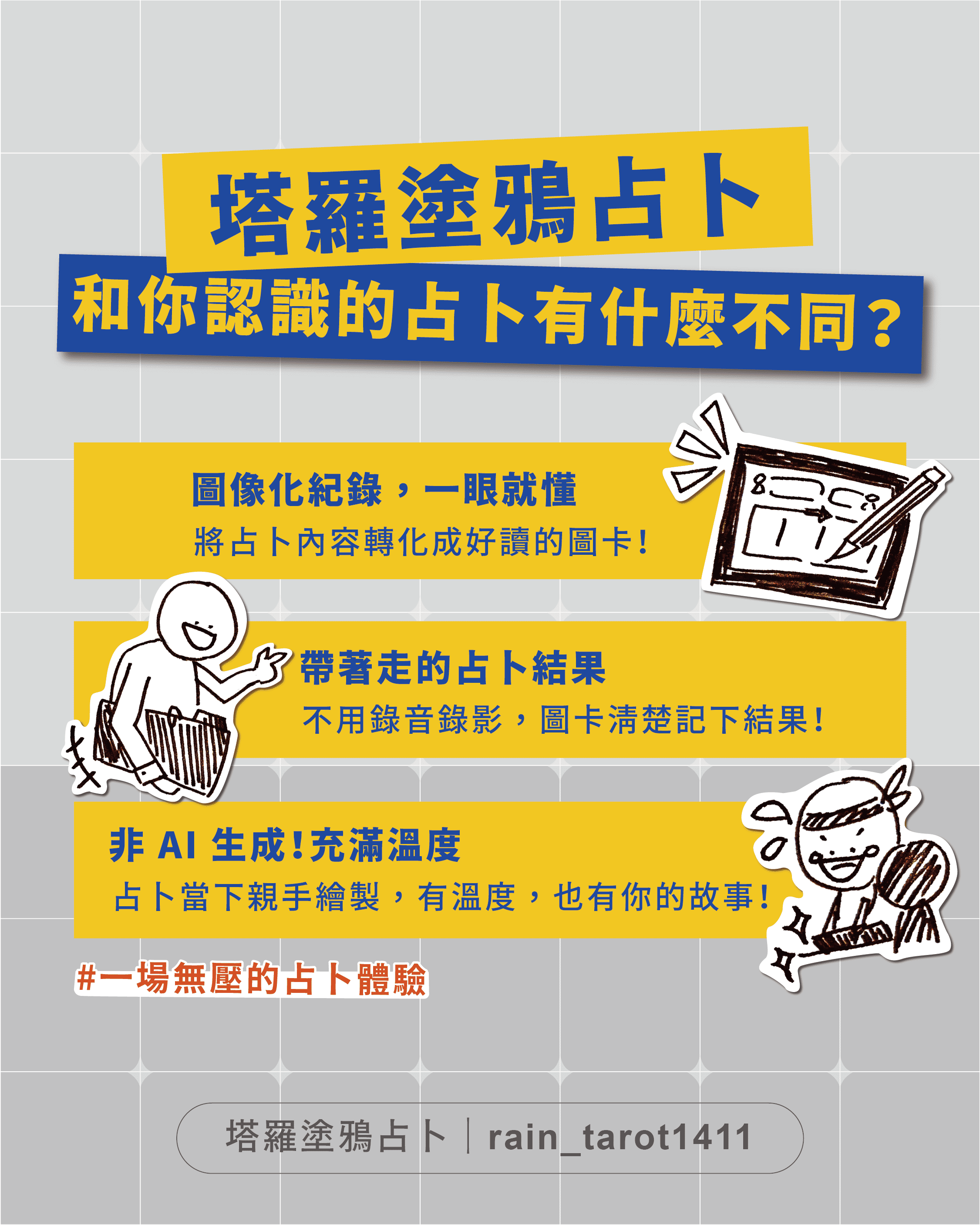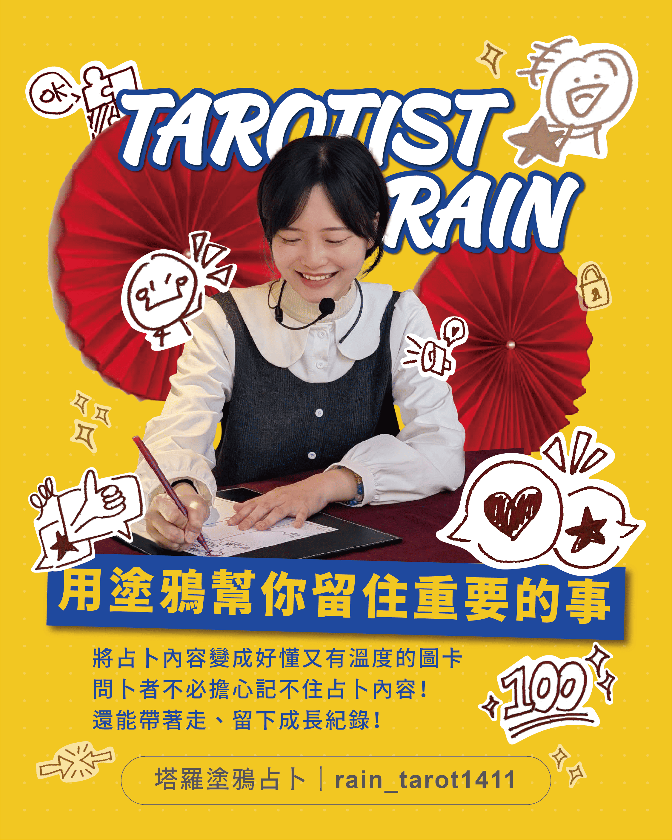 擅長在解牌的同時,將整個占卜內容用塗鴉的方式記錄下來,把長長的訊息,轉化成一張好懂、有趣、又帶著溫度的圖卡。